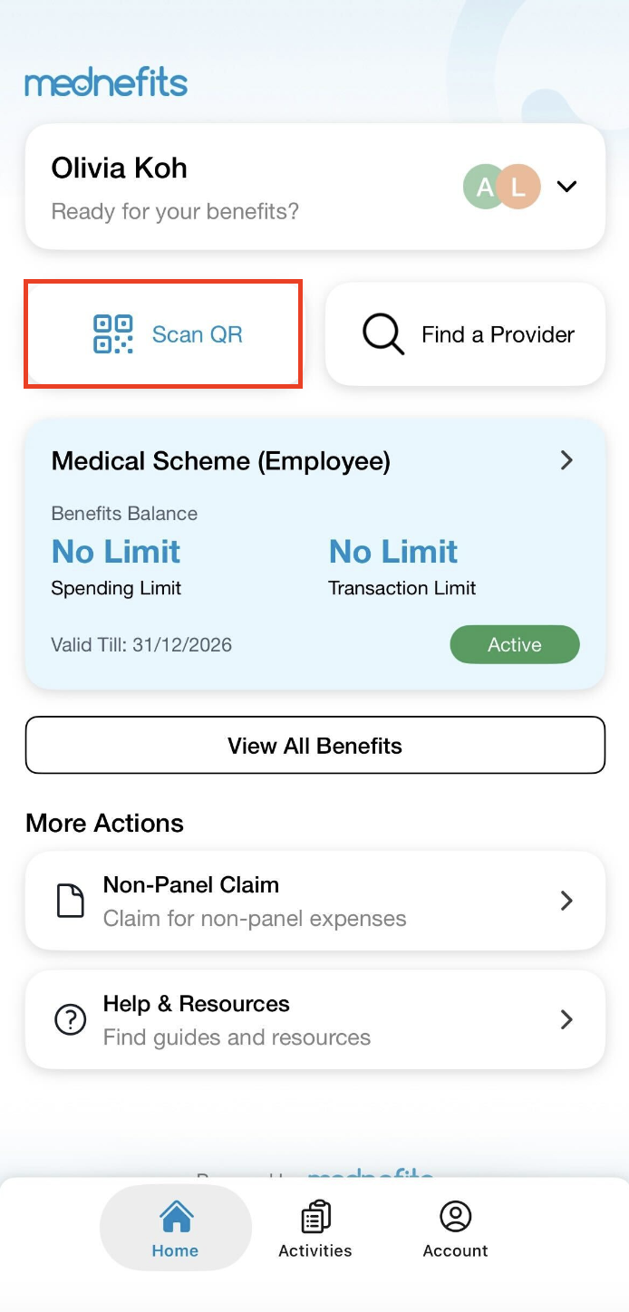 Step 1: On your homepage, tap on Scan QR. Then, select the members (if available) and scanned the QR code provided by the panel provider.