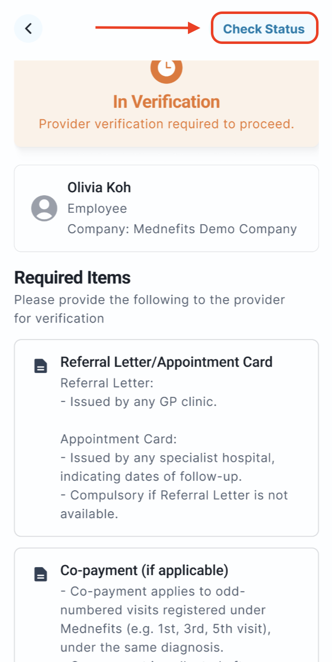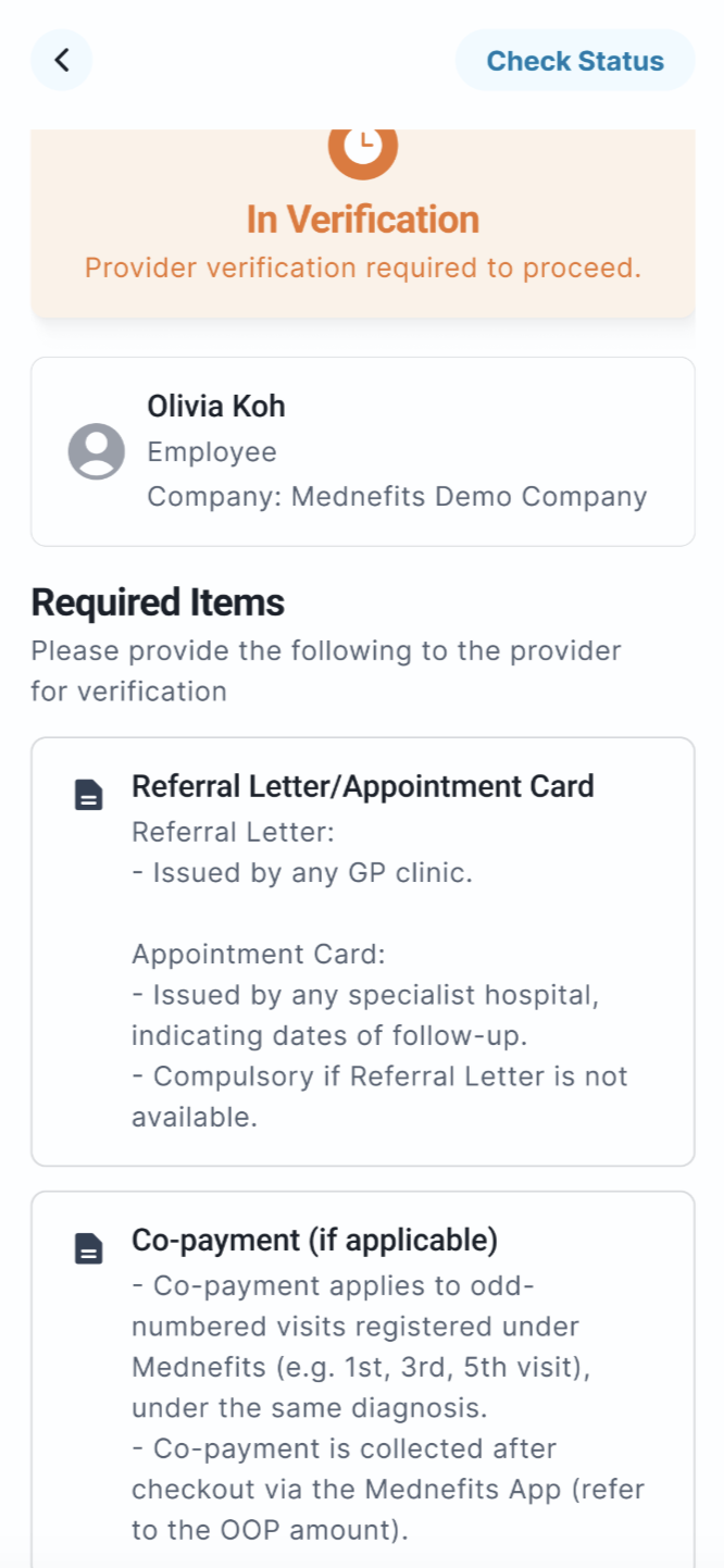 Step 2: You will be directed to the In Verification page (if applicable). Kindly present the listed required items to the provider for their further verification.