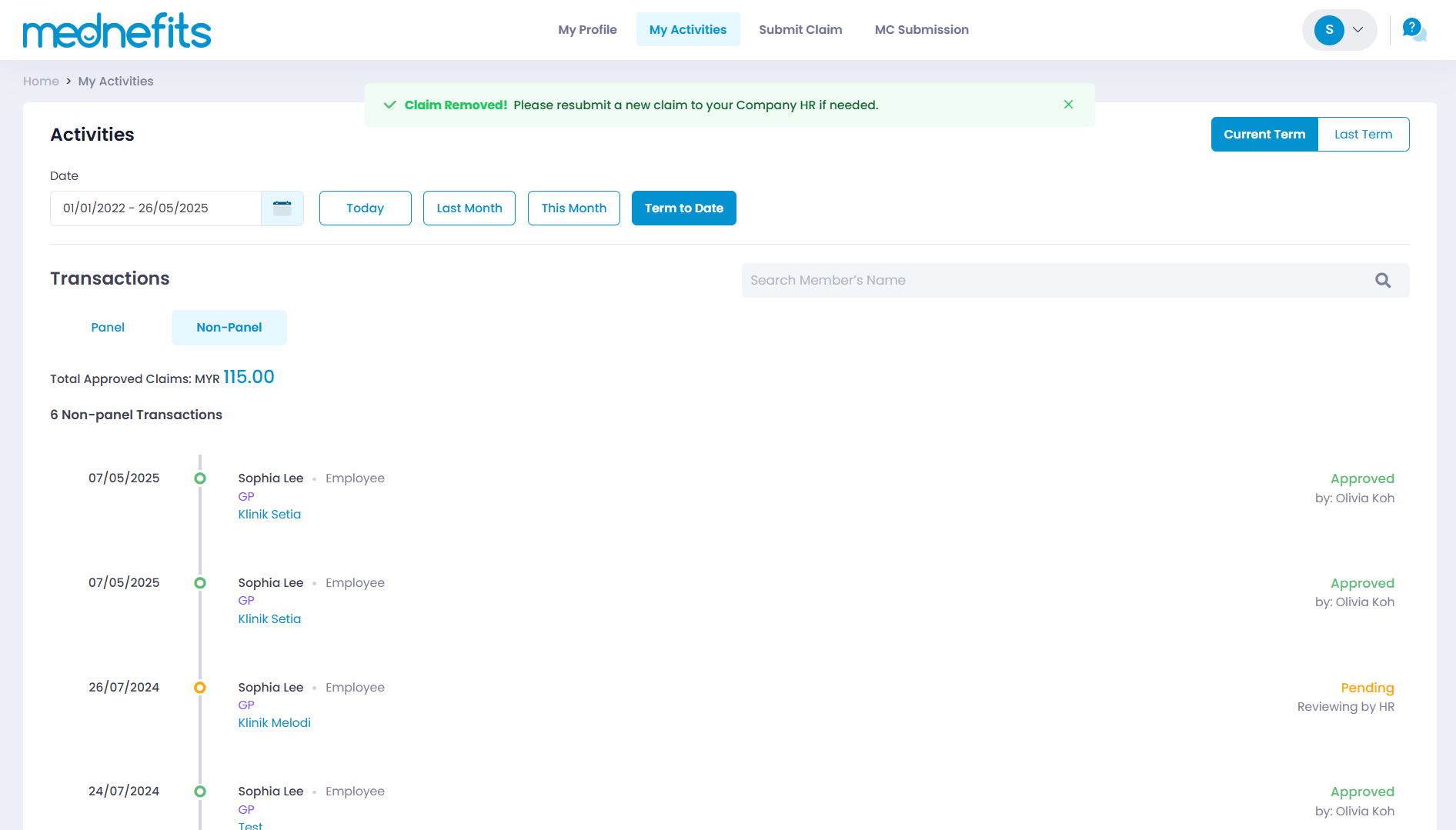Step 4: A green banner with the message of "Claim Removed! Please resubmit a new claim to your Company HR if needed" indicates that you have successfully removed your claims!