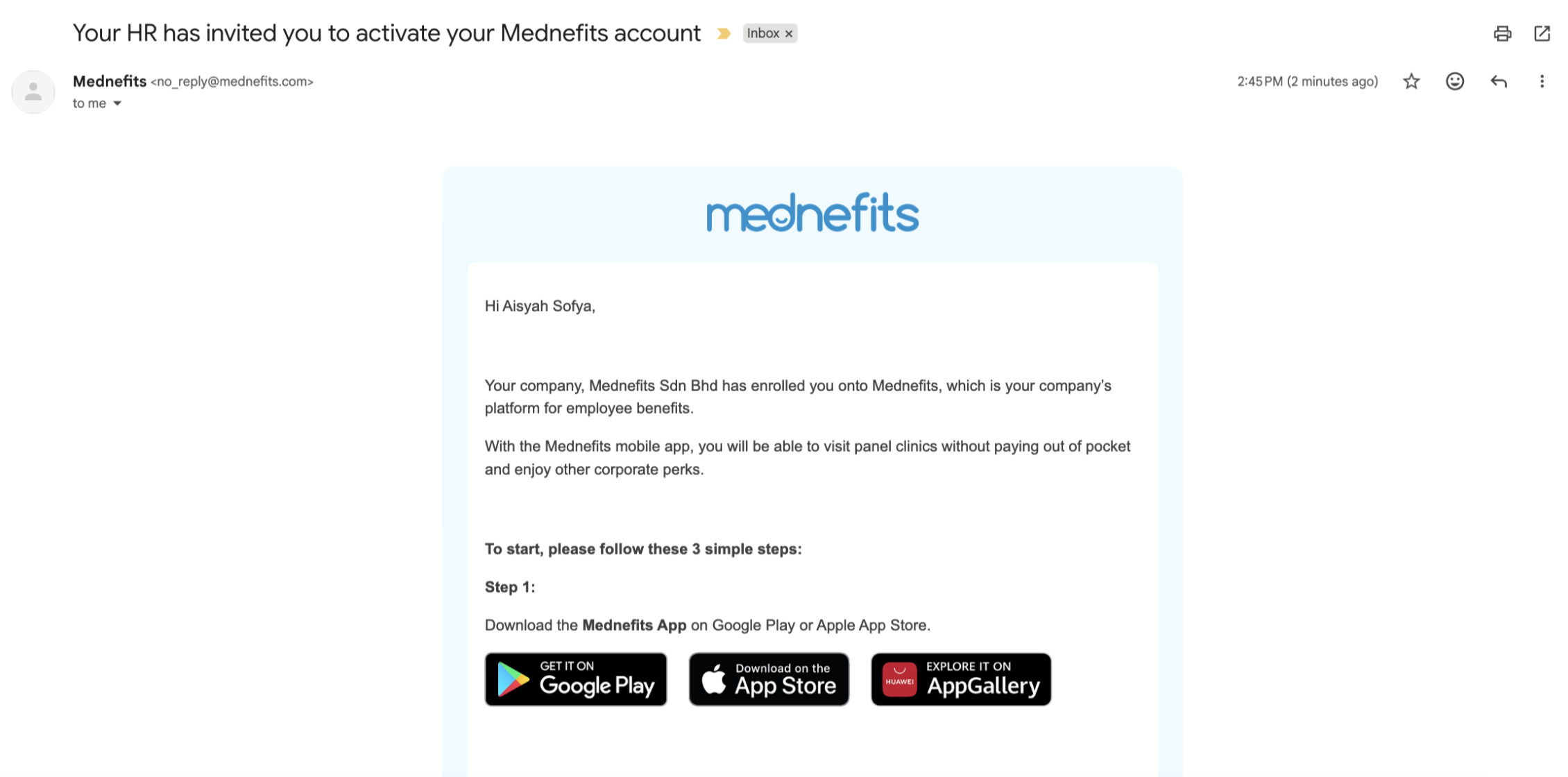 If you have received an email/Whatsapp/SMS about being enrolled in Mednefits, such as below: