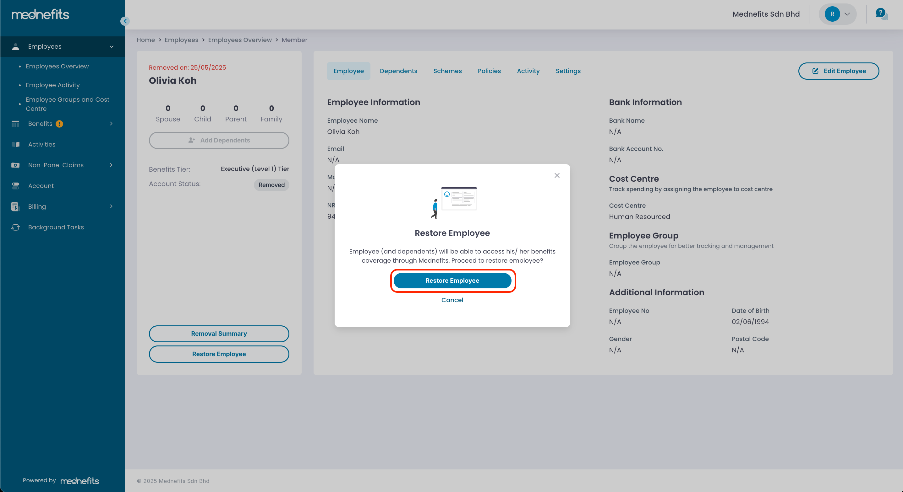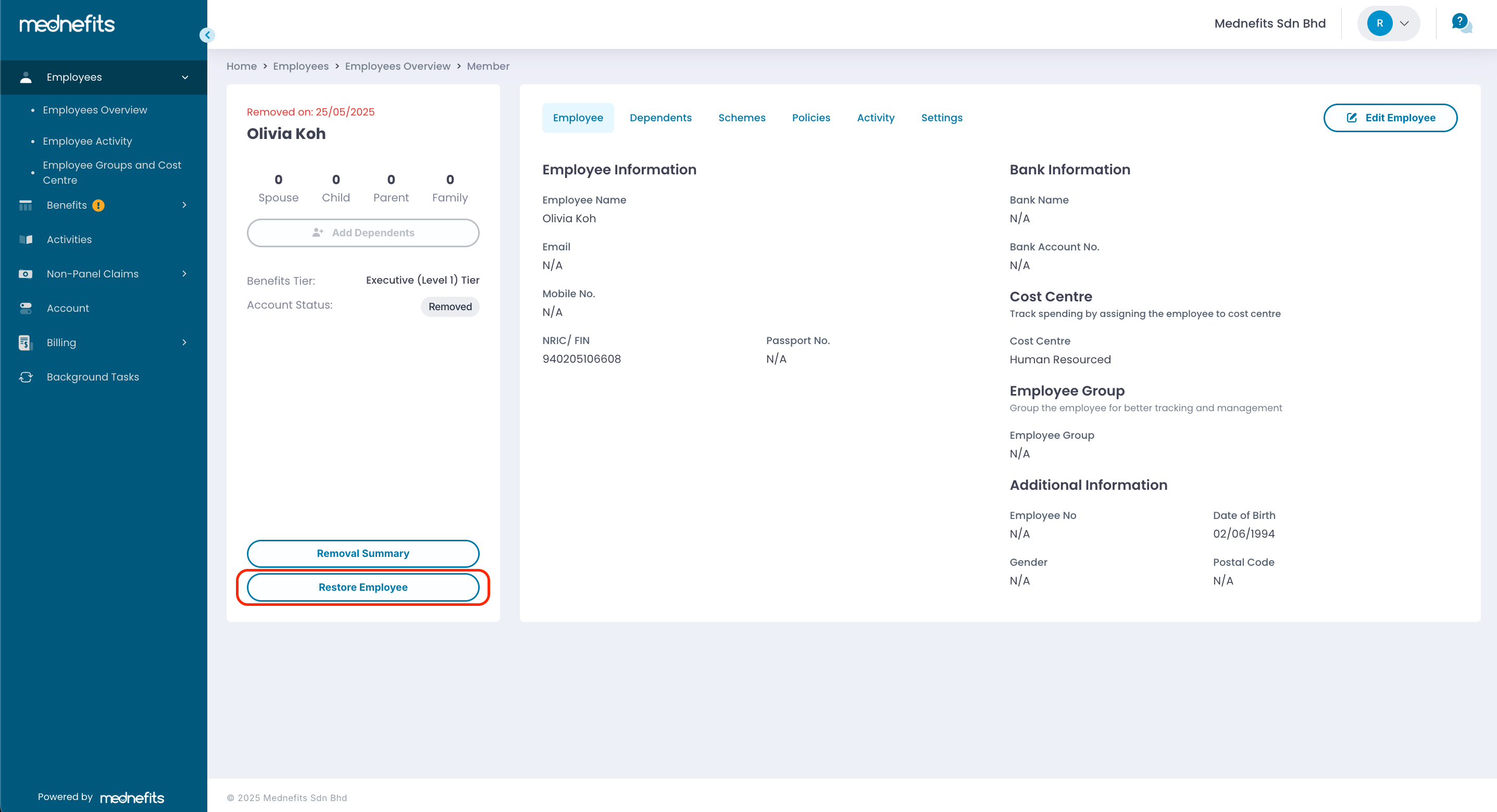 When an employee leaves the organisation, they will need to be removed from your company's Mednefits account. In various cases, you might need to restore their account when any resigned employee rejoins the organisation.