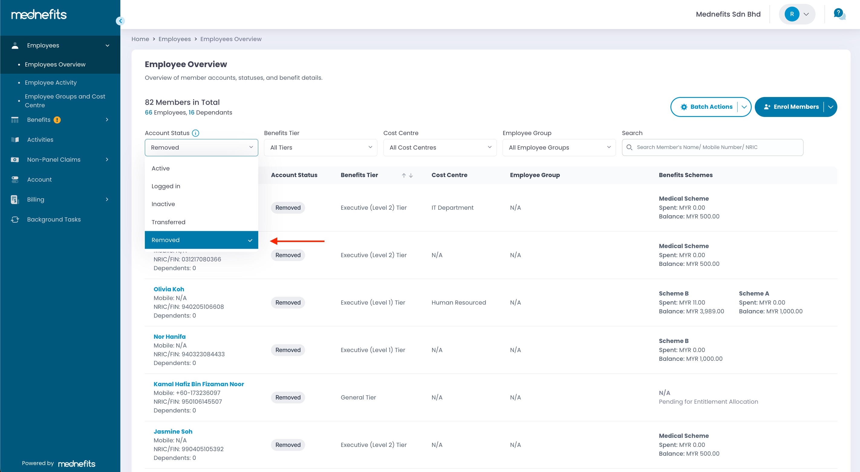 Step 1: On the Employees Overview page, filter the status by selecting Removed to find the employee you wish to restore.